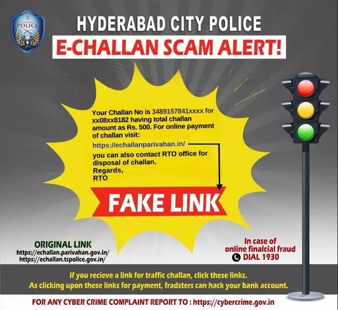 Hyderabad: City cybercrime police has warned the public about a growing cyber fraud involving fake e-challan payment links being circulated through SMS and WhatsApp messages.