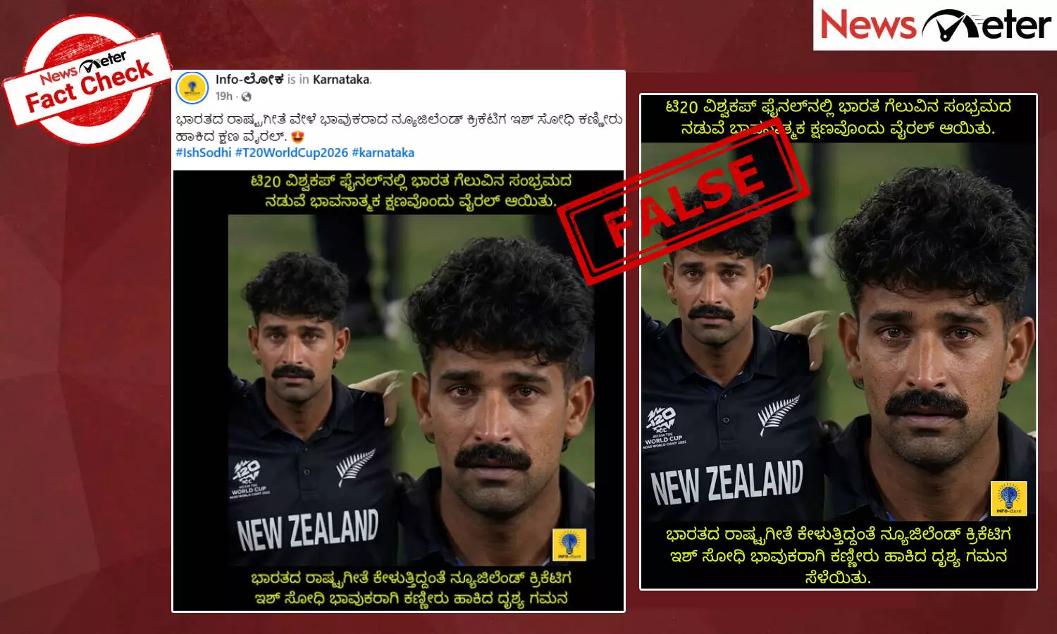 ಮಾರ್ಚ್ 8 ರಂದು ನಡೆದ ಟಿ20 ವಿಶ್ವಕಪ್ 2026 ರ ಫೈನಲ್ನಲ್ಲಿ ಭಾರತ ತಂಡ ನ್ಯೂಜಿಲೆಂಡ್ ತಂಡವನ್ನು ಸೋಲಿಸಿ ಗೆಲುವು ಸಾಧಿಸಿತು. ಇದರ ಬೆನ್ನಲ್ಲೇ ನ್ಯೂಜಿಲೆಂಡ್ ಆಟಗಾರ ಇಶ್ ಸೋಧಿ ಅವರ ಫೋಟೋವೊಂದು ಸಾಮಾಜಿಕ ಜಾಲತಾಣಗಳಲ್ಲಿ ವೈರಲ್ ಆಗುತ್ತಿದೆ. ಫೋಟೋದಲ್ಲಿ ಅವರು ಅಳುತ್ತಿರುವುದು ಕಂಡುಬರುತ್ತದೆ. ಪಂದ್ಯಕ್ಕೂ ಮುನ್ನ ಭಾರತದ ರಾಷ್ಟ್ರಗೀತೆ ನುಡಿಸಿದಾಗ ಅವರು ಭಾವುಕರಾದರು ಮತ್ತು ಅವರ ಕಣ್ಣುಗಳಲ್ಲಿ ನೀರು ಬಂತು ಎಂಬ ಹೇಳಿಕೆಯೊಂದಿಗೆ ಹಂಚಿಕೊಳ್ಳಲಾಗುತ್ತಿದೆ.