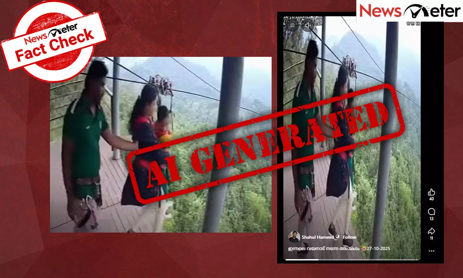 വയനാട്ടില് സിപ് ലൈന് അപകടമുണ്ടായതായി സമൂഹമാധ്യമങ്ങളില് പ്രചാരണം. സിപ് ലൈനില് കൈക്കുഞ്ഞുമായി കയറുന്ന സ്ത്രീ അപകടത്തില്പെടുന്നതും പിന്നാലെ ഓപ്പറേറ്റര് താഴേക്ക് പതിക്കുന്നതുമാണ് ദൃശ്യങ്ങളില്. വയനാട്ടില് 2025 ഒക്ടോബര് 27 നുണ്ടായ അപകടമെന്ന വിവരണത്തോടെ പ്രചരിക്കുന്ന വീഡിയോ സിസിടിവി ദൃശ്യങ്ങള്ക്ക് സമാനമായ രീതിയിലാണുള്ളത്. തിയതിയും സമയവുമെല്ലാം ദൃശ്യങ്ങളില് കാണാം.