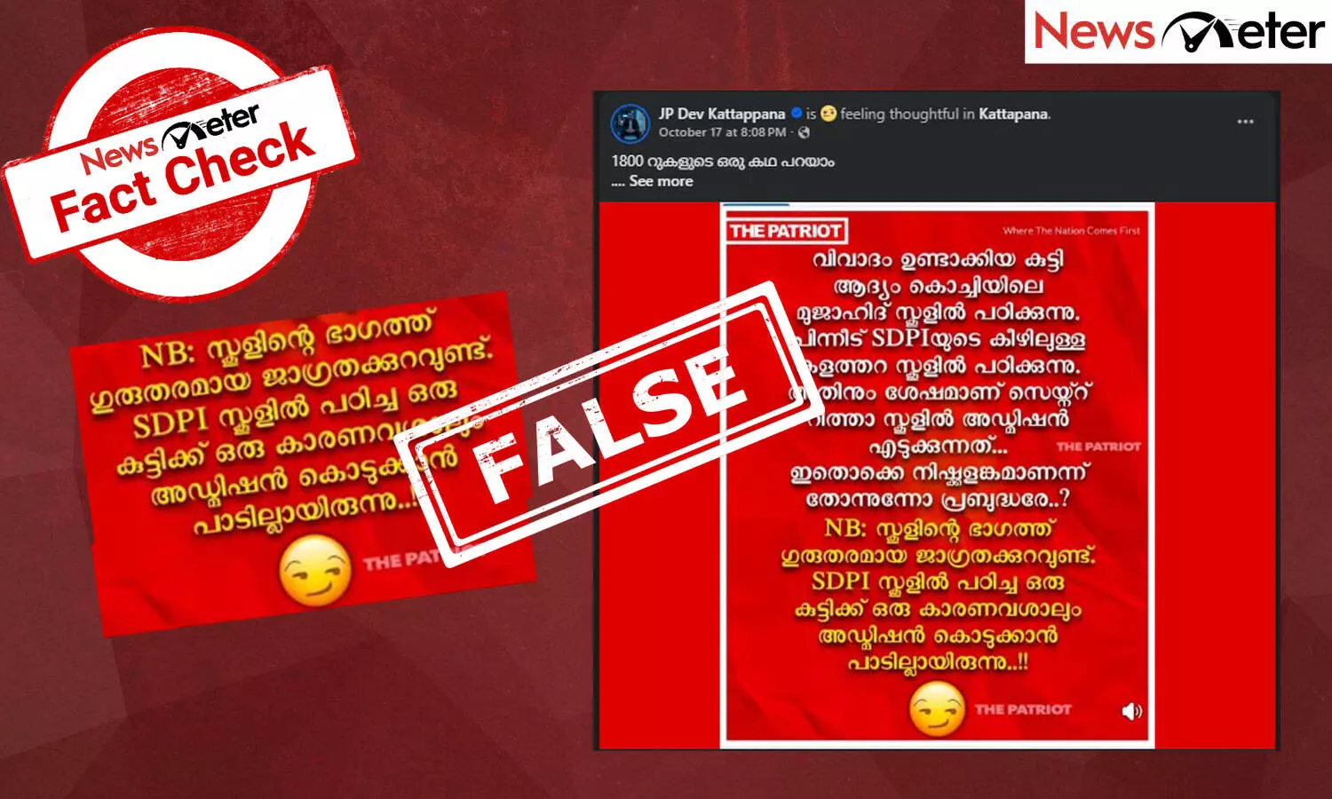 പ്രചാരണം തെറ്റിദ്ധരിപ്പിക്കുന്നതാണെന്നും SDPI-യുടെ സ്കൂളിലല്ല വിദ്യാര്ത്ഥി പഠിച്ചതെന്നും അന്വേഷണത്തില് കണ്ടെത്തി.