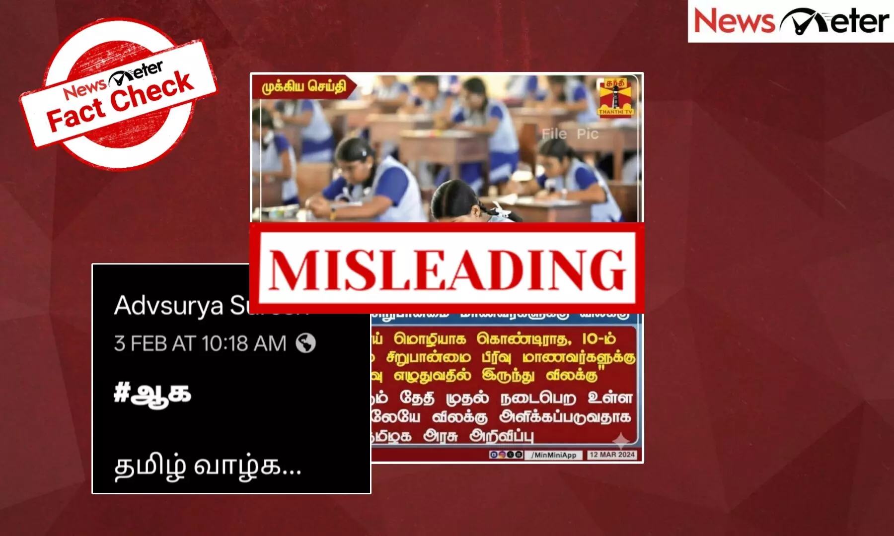 “தமிழ் பாடம்- சிறுபான்மை மாணவர்களுக்கு விலக்கு” என்ற தலைப்புடன் "தமிழை தாய் மொழியாக கொண்டிராத, 10-ம் வகுப்பு படிக்கும் சிறுபான்மை பிரிவு மாணவர்களுக்கு தமிழ் தேர்வு எழுதுவதில் இருந்து விலக்கு' வரும் 26 ஆம் தேதி முதல் நடைபெற உள்ள பொதுத்தேர்விலேயே விலக்கு அளிக்கப்படுவதாக தமிழக அரசு அறிவிப்பு” என்று தந்தி டிவி ஊடகம் வெளியிட்டுள்ள நியூஸ் கார்ட் சமூக வலைதளங்களில் வைரலாகி வருகிறது.