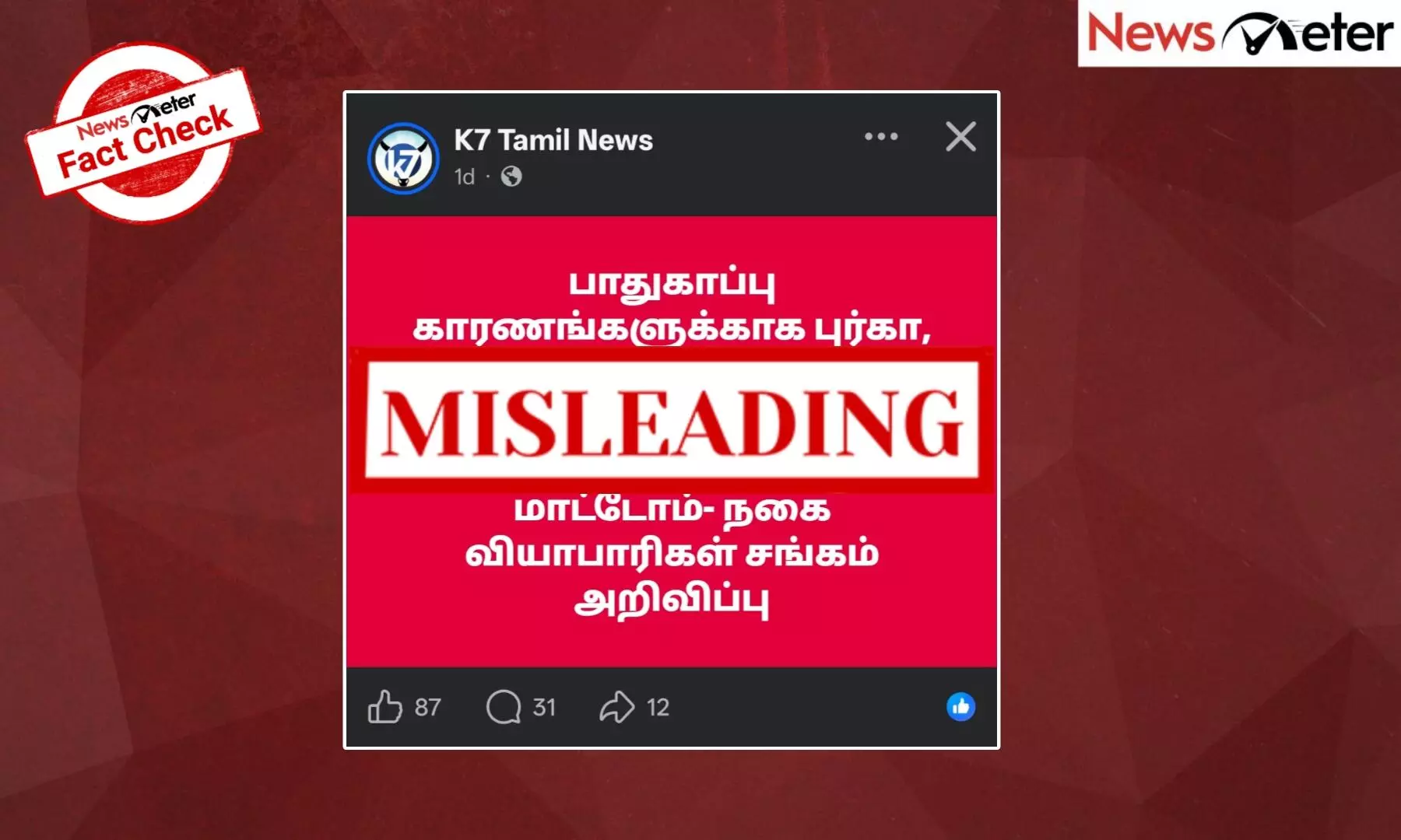 பாதுகாப்பு காரணங்களை முன்வைத்து ஹிஜாப் அணிந்து வரும் வாடிக்கையாளர்களுக்கு நகைகள் விற்பனை செய்யப்பட மாட்டாது என நகை வியாபாரிகள் சங்கம் அறிவித்துள்ளதாக 'தினகரன்' ஊடகத்தின் நியூஸ் கார்டு ஒன்று சமூக வலைதளங்களில் (Archive) வைரலாகி வருகிறது. அந்த நியூஸ் கார்டில் குறிப்பிட்ட இடம் (ஊர் அல்லது மாநிலம்) இடம்பெறாததால், இது தமிழ்நாட்டில் எடுக்கப்பட்ட முடிவு என்று பலரும் தவறாகப் புரிந்துகொண்டு கருத்துக்களைப் பதிவிட்டு வருகின்றனர்.