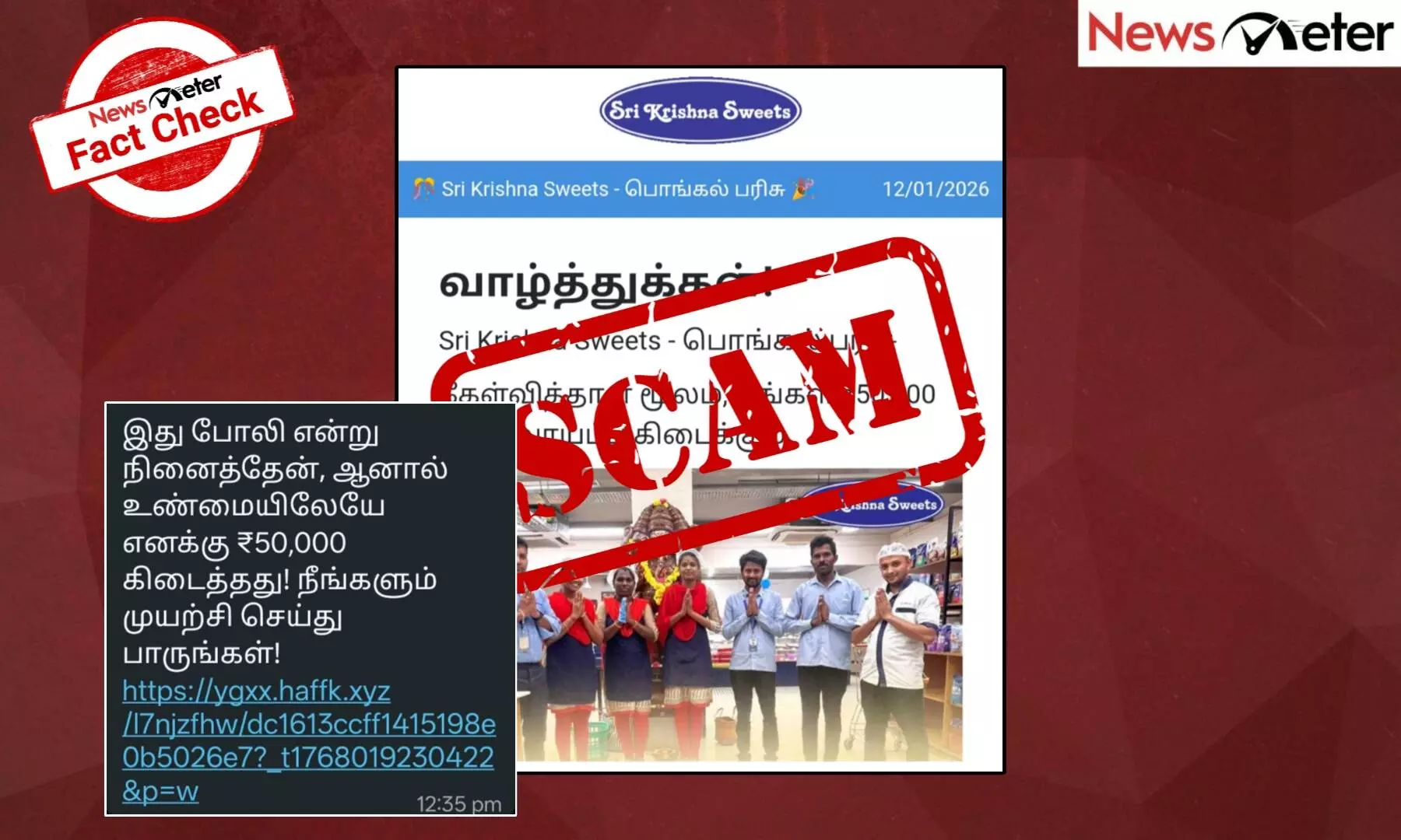 முடிவாக, நம் தேடலில் ஸ்ரீ கிருஷ்ணா ஸ்வீட்ஸ் நிறுவனம் ரூபாய் 50,000 பரிசுத்தொகை வழங்கப்பட உள்ளதாக சமூக வலைதளங்களில் வைரலாகும் தகவல் மற்றும் இணைய லிங்க் ஸ்பேம் என்று தெரியவந்தது.