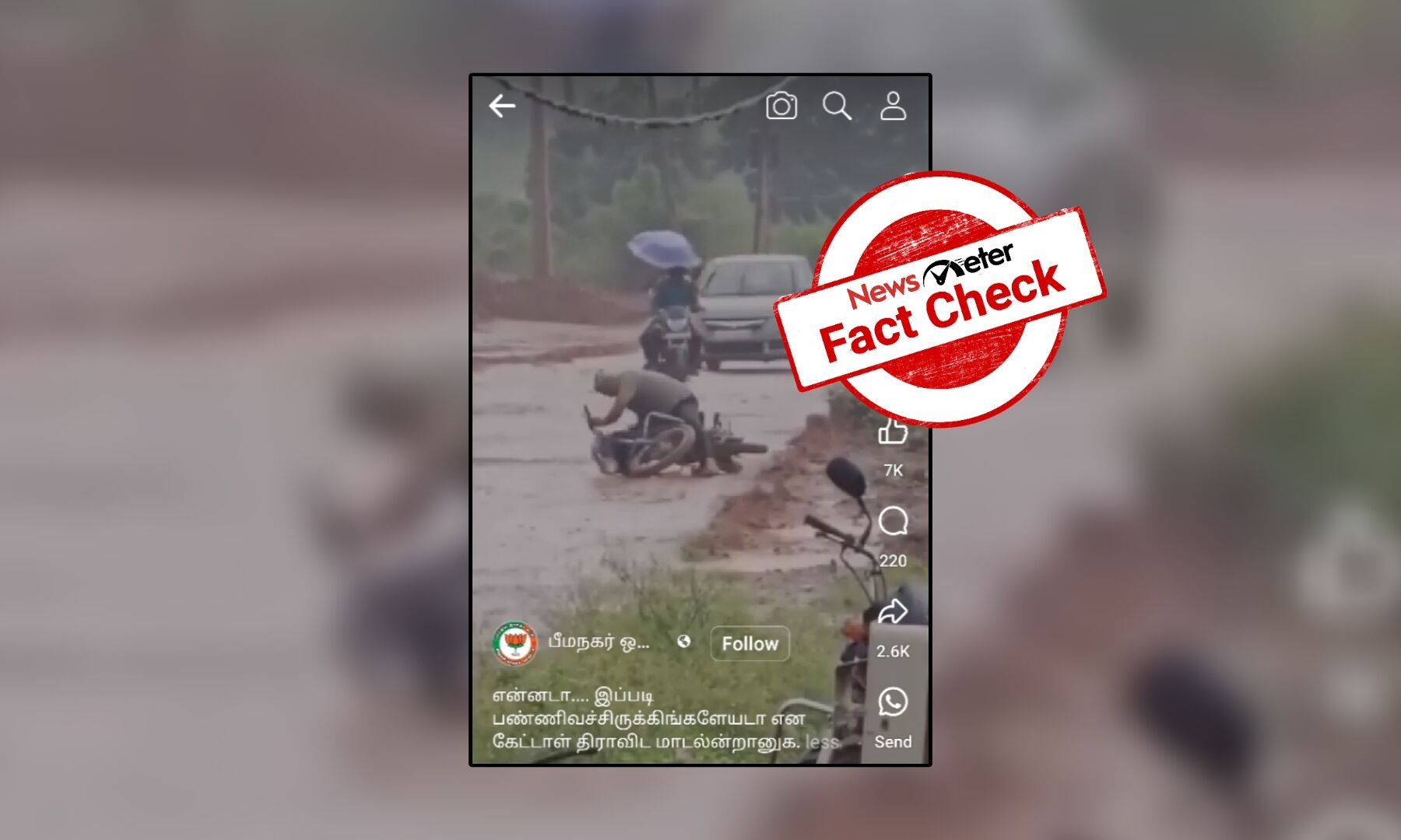 "என்னடா.... இப்படி பண்ணிவச்சிருக்கிங்களேயடா என கேட்டாள் திராவிட மாடல்ன்றானுக" என்ற கேப்ஷனுடன் காணொலி ஒன்றை வலதுசாரியினர் பலரும் சமூக வலைதளங்களில் பரப்பி வருகின்றனர். அதில், கரடுமுரடான சாலையில் இருசக்கர வாகனத்தில் வந்துகொண்டிருக்கும் சிலர் தடுமாறி கீழே விழும் காட்சி பதிவாகியுள்ளது.