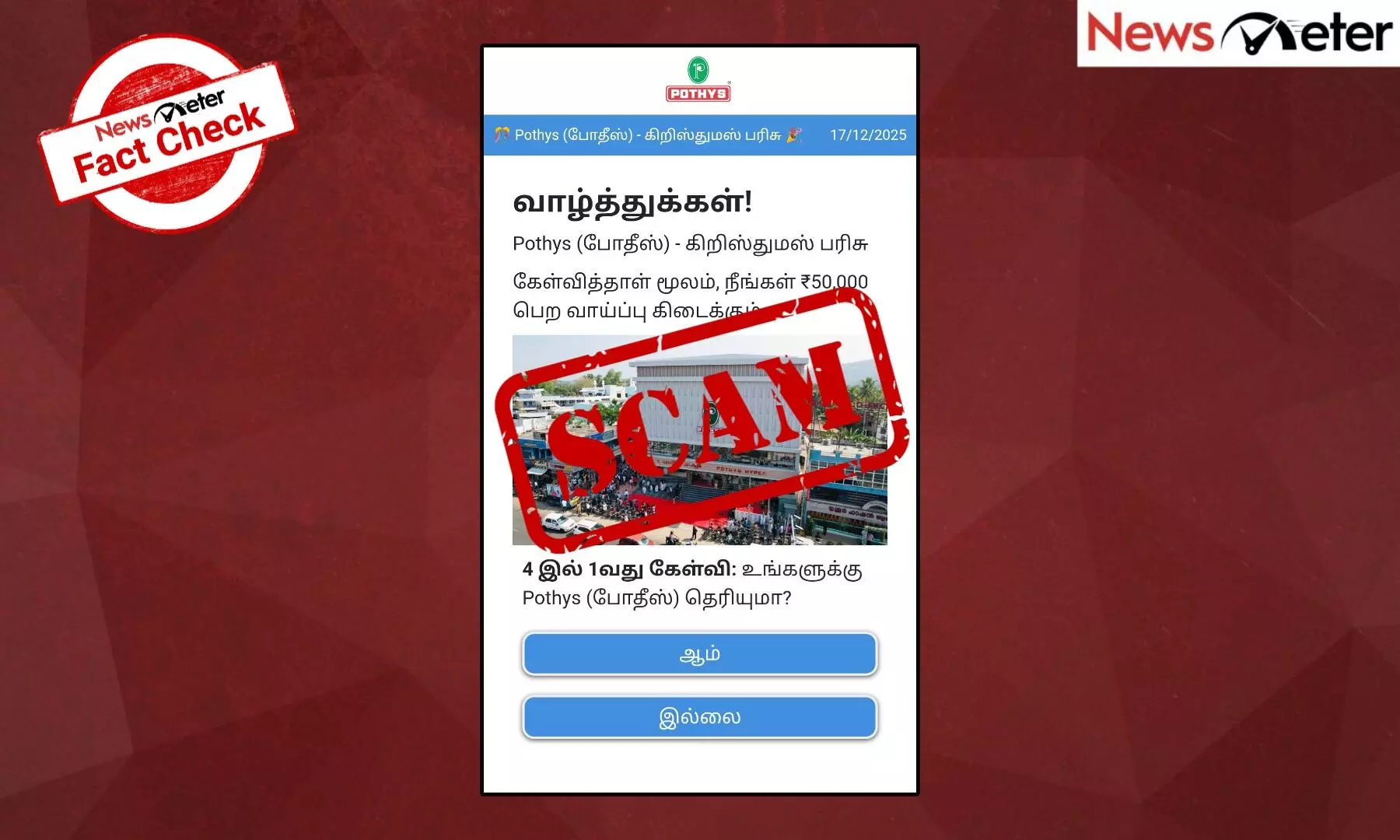 கிறிஸ்துமஸ் பண்டிகையை முன்னிட்டு 'போதீஸ்' நிறுவனம் ரூ.50,000 பரிசு வழங்குவதாகப் பரவும் தகவல் ஸ்பேம் என்று தெரியவந்தது.