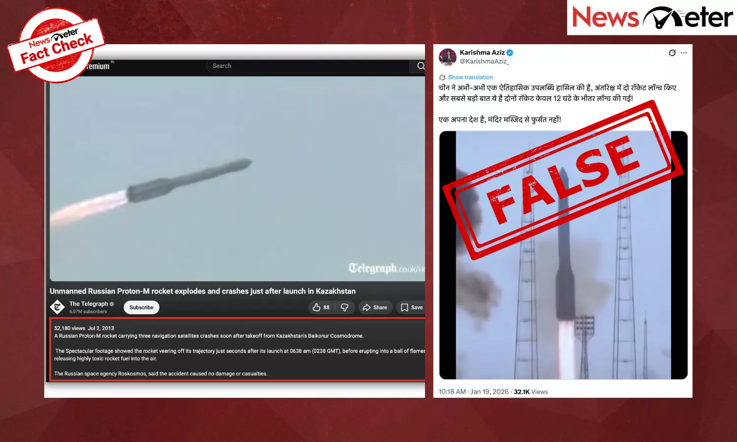 NewsMeter found that the claim is false. The viral video does not show a Chinese rocket launch. Instead, it is footage from July 2013, documenting the failure of a Russian Proton-M rocket launched from the Baikonur Cosmodrome in Kazakhstan.