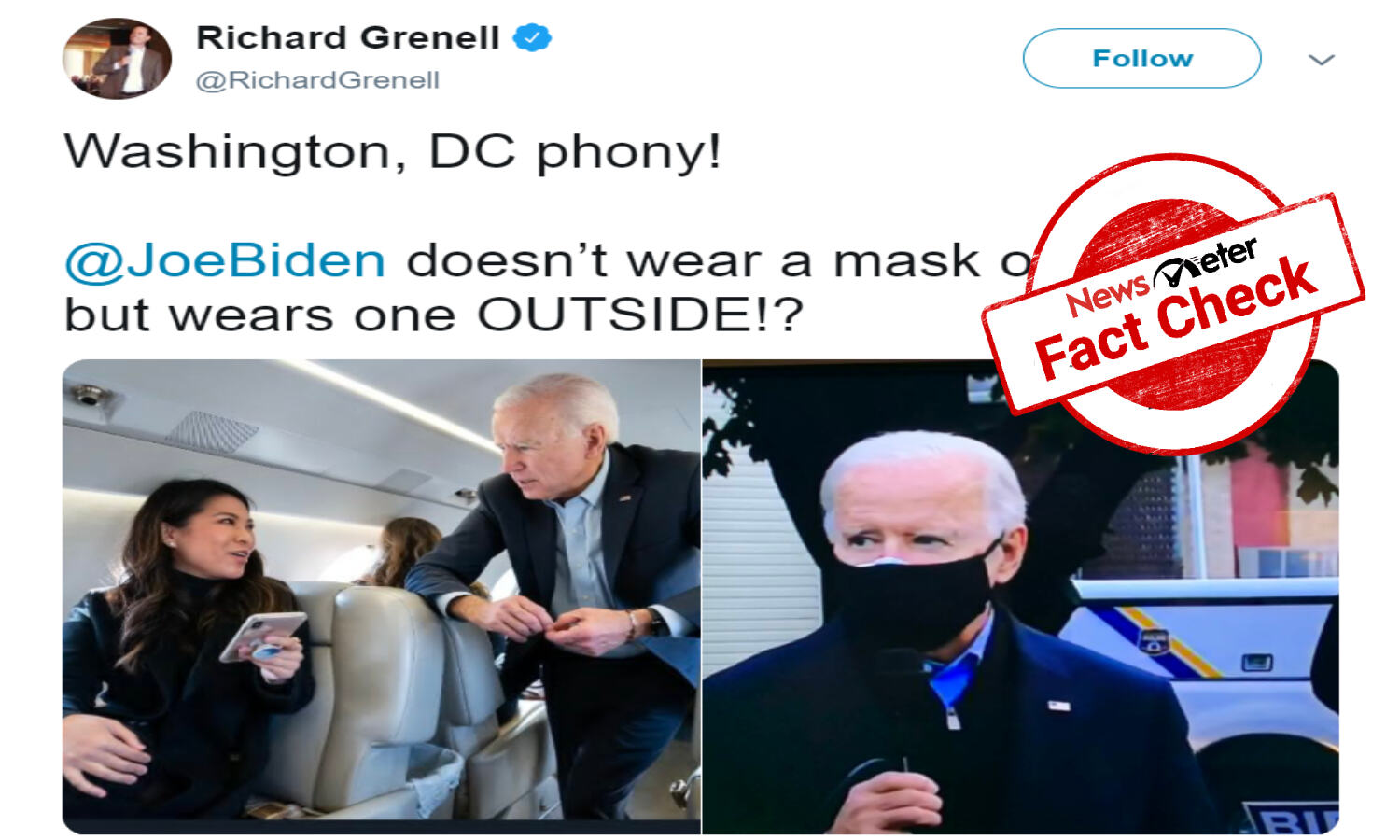 This photo was also tweeted by former Acting Director of the United States National Intelligence and Republican member Richard Grenell with the text that read, "Washington, DC phony! @JoeBiden doesn't wear a mask on a plane - but wears one OUTSIDE!? (sic)."