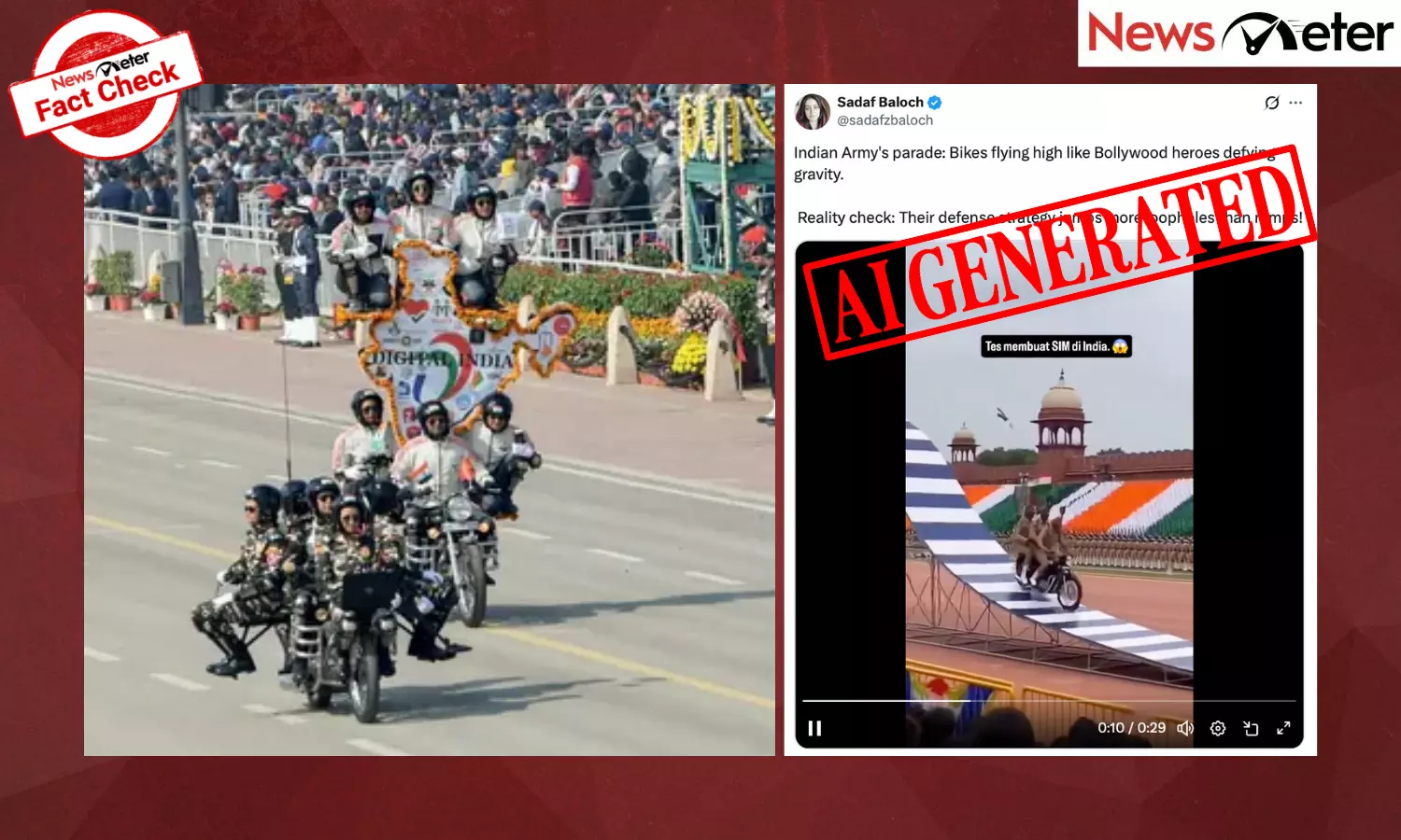 NewsMeter found that the claim is false. The viral video is AI-generated and does not show real stunts from the Republic Day parade.