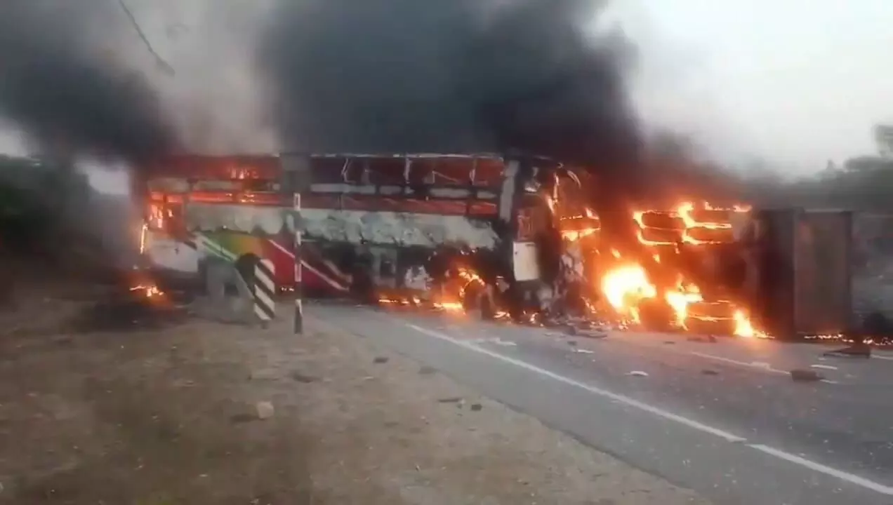 A speeding tipper lorry reportedly rammed into the bus, triggering a massive blaze. Both vehicles were engulfed in flames within minutes and were completely gutted.