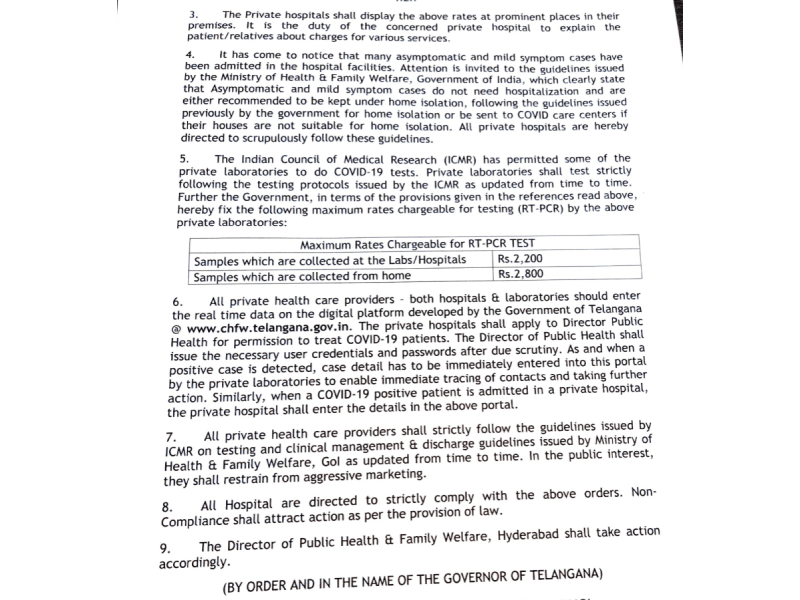 Govt fixes price card for COVID-19 test,treatment in private hospitals, labs in Telangana